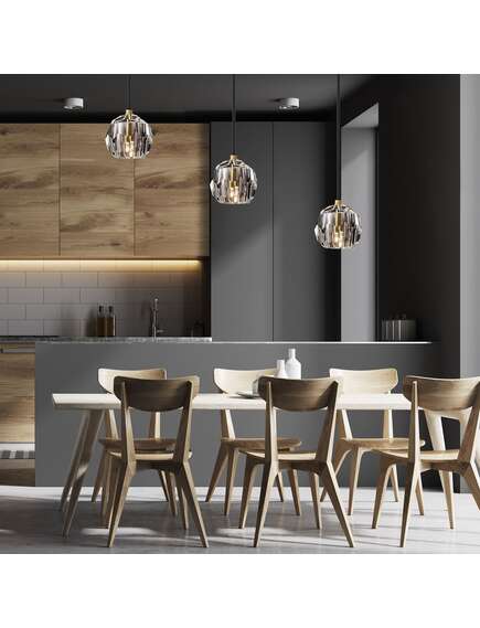 | Lampa została wykonana z metalu i kryształowego klosza. Czarny kolor nadaje lampie wyjątkowego klimatu, który wpasuje się w niemal każdą aranżację. Prosty styl sprawia, że lampa pasować będzie do każdego pomieszczenia – zarówno do kuchni, salonu czy przedpokoju.