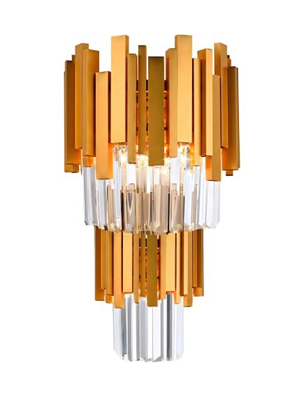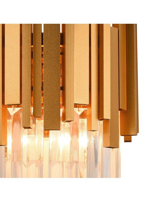 | Stylowy kinkiet ścienny to wyrazista propozycja dla wnętrz, w których liczy się elegancja i efektowny detal. Konstrukcja została wykonana z metalu, a jej frontowa część w złotym wykończeniu tworzy mocny, nowoczesny kontrast z dekoracyjnymi szklanymi kryształkami, które subtelnie odbijają i rozpraszają światło. Całość uzupełnia prostokątna maskownica w chromowanym wykończeniu, dodająca oprawie luksusowego charakteru.