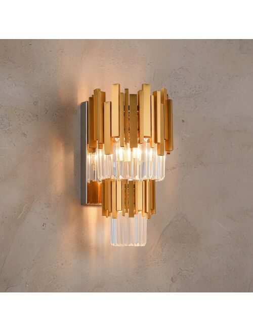 Wiszące kryształowe elementy nadają kinkietowi lekkości i dekoracyjnej głębi, tworząc efekt delikatnej gry światła na ścianie. Kinkiet przystosowany jest do dwóch żarówek z gwintem E14, co pozwala na swobodny dobór barwy i mocy światła w zależności od potrzeb aranżacyjnych.