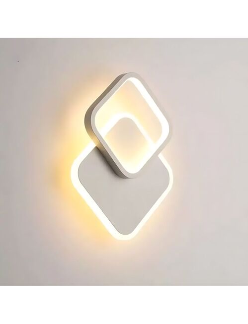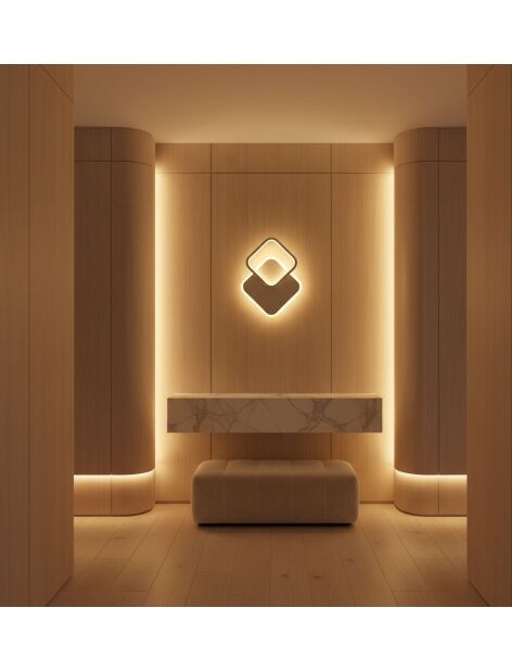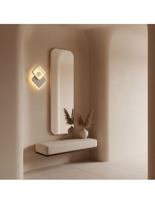 | Nowoczesny kinkiet o geometrycznej formie to idealne połączenie minimalistycznego wzornictwa i nastrojowego oświetlenia. Dwa delikatnie zachodzące na siebie kwadraty tworzą przestrzenną kompozycję, która subtelnie podkreśla ścianę i dodaje wnętrzu przyjemnego, przytulnego klimatu. Zintegrowane oświetlenie LED emituje miękkie, równomierne światło, świetnie sprawdzające się jako oświetlenie dekoracyjne w przedpokoju, salonie, sypialni lub przy lustrze.