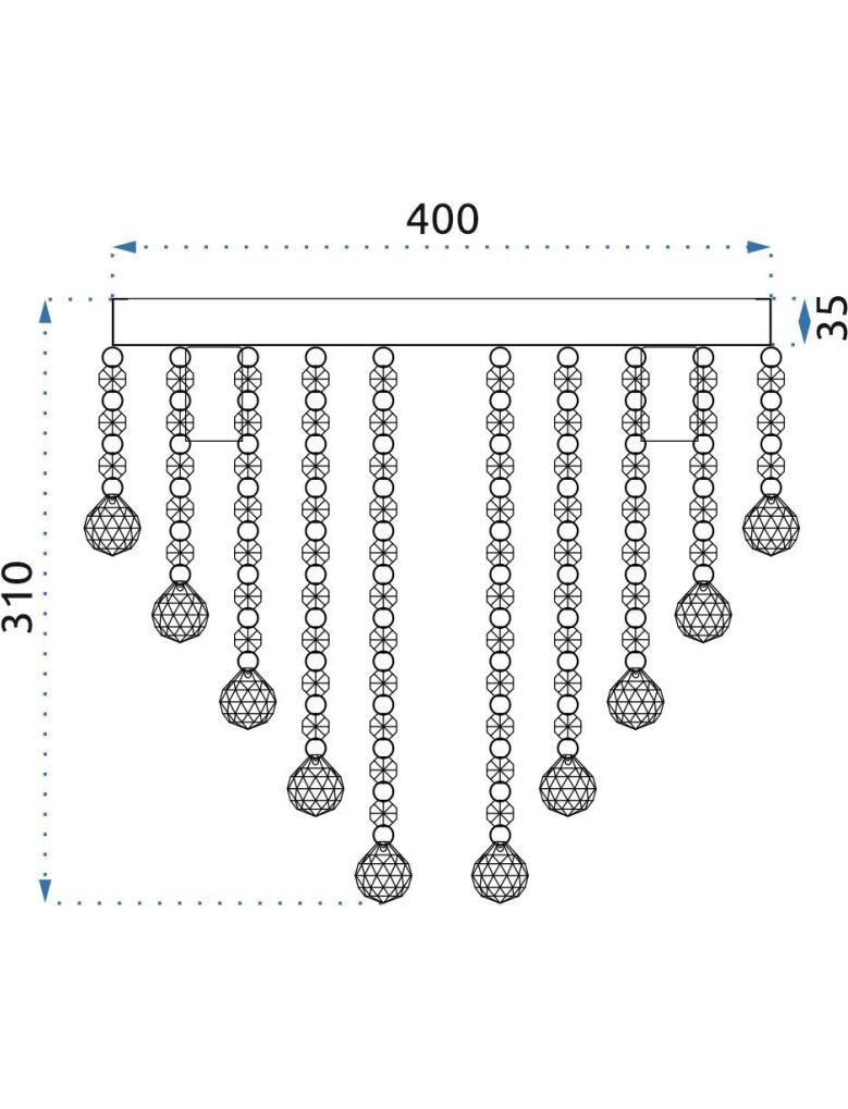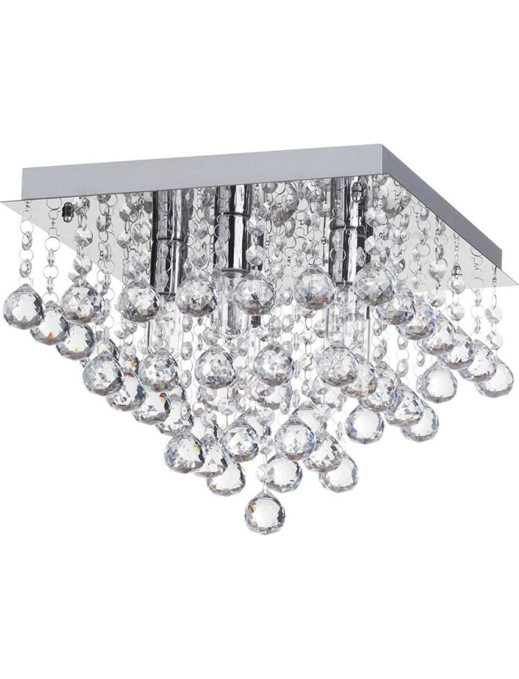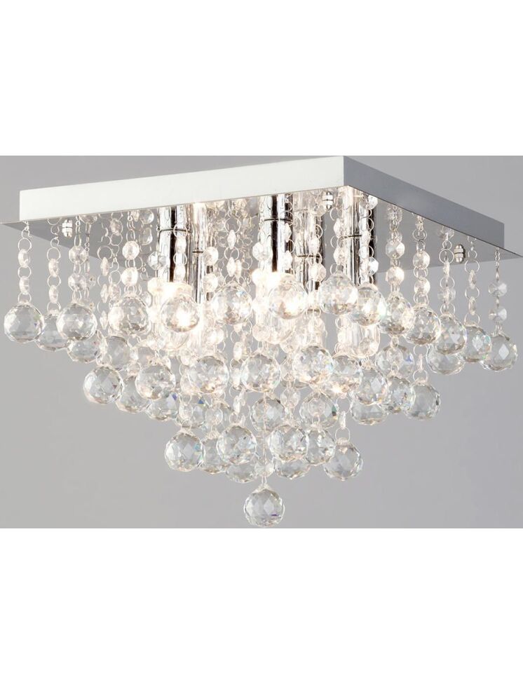 | Plafon został wykonany z wysokiej jakości metalu odpornego na zarysowania czy uszkodzenia mechaniczne. Całego charakteru i eleganckiej nuty dodają kryształy rozmieszczone na niemal całej powierzchni lampy.