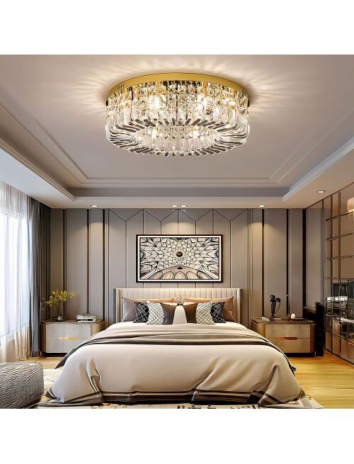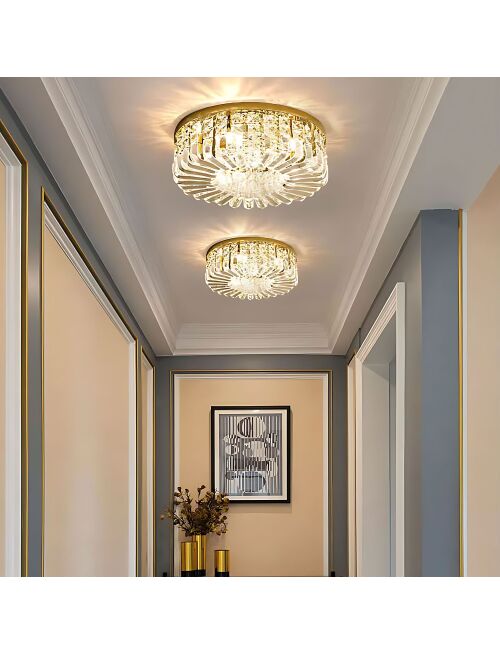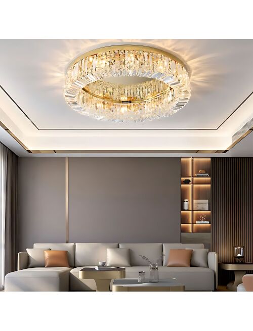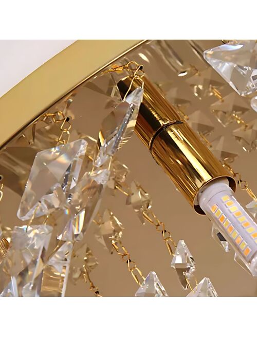 Lampa kryształowa w złotym wykończeniu to elegancki element dekoracyjny, który zachwyca swoją formą i jakością wykonania. Jej okrągła konstrukcja z metalową ramą w złotym kolorze doskonale współgra z kryształowymi detalami, tworząc efektowne oświetlenie pełne blasku. Światło przenikające przez liczne kryształowe elementy rozprasza się w pomieszczeniu, nadając mu wyjątkowy, luksusowy charakter. Doskonała do salonu, sypialni czy przedpokoju – zapewnia styl i komfort każdego dnia.