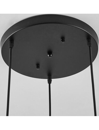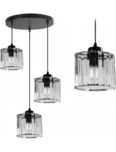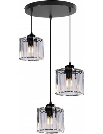 Lampa posiada trzy klosze, przewody oraz metalową maskownica przy suficie.Wyposażona została w najpopularniejszy gwint przeznaczony do żarówki E27. |