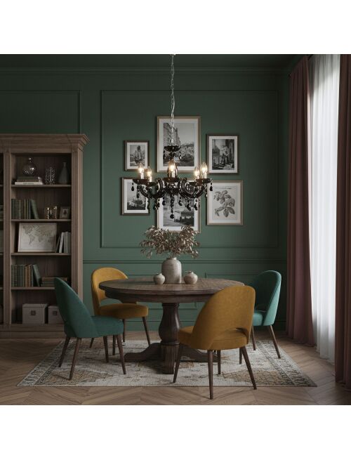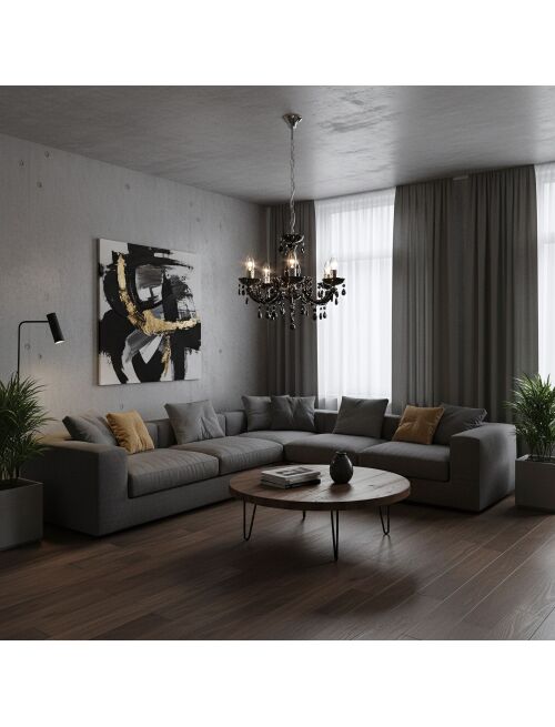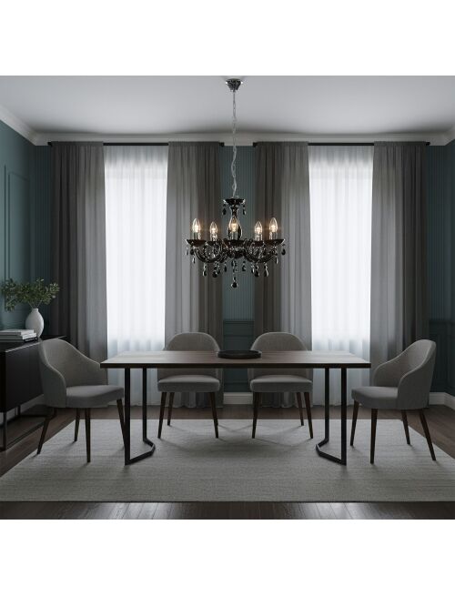 Czarny żyrandol z pięcioma ramionami i chromowanymi akcentami to mocny, elegancki akcent do jadalni lub salonu. Transparentne, czarne zawieszki pięknie łapią światło, a regulowana wysokość ułatwia dopasowanie lampy do stołu i wysokości pomieszczenia.