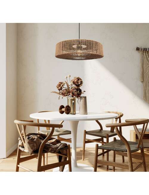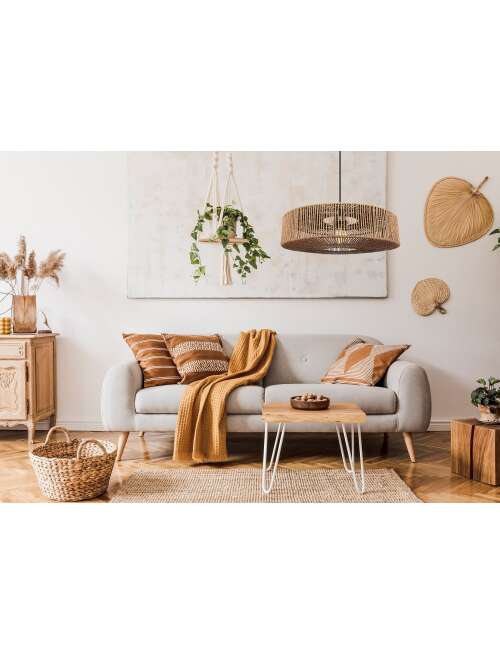 | Klosz lampy wykonany jest z sznurków jutowych natomiast maskownica z metalu. Unikalne połączenie naturalnych materiałów oraz subtelnego designu przyciąga uwagę i tworzy przytulną atmosferę. Wyjątkowy kształt doskonale sprawdzi się w każdym pomieszczeniu niezależnie od stylu jego wykończenia. Lampa do samodzielnego montażu. |