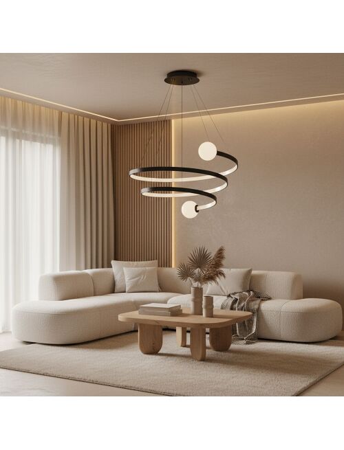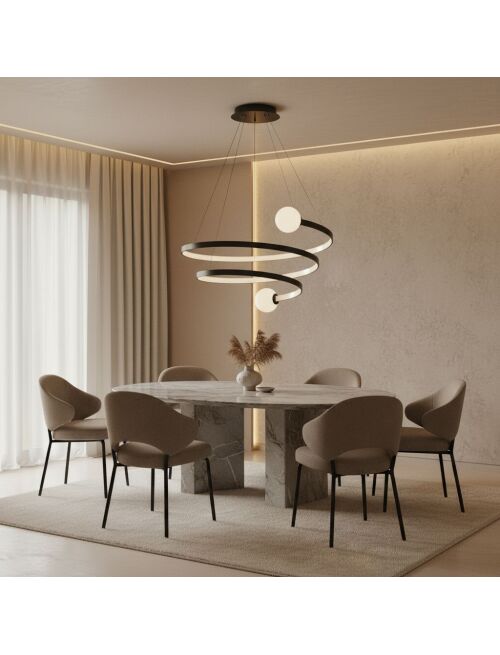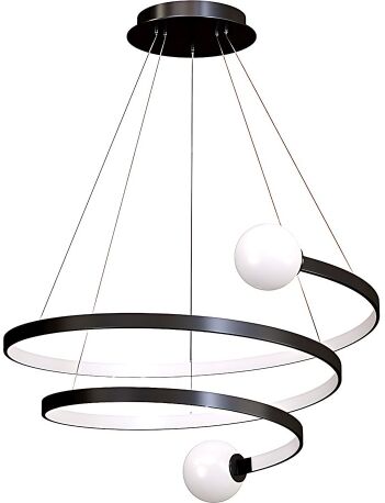 | Nowoczesna lampa wisząca o efektownej, spiralnej formie to propozycja, która przyciąga uwagę już od pierwszego spojrzenia. Połączenie delikatnie zakrzywionych pierścieni z kulistymi kloszami tworzy harmonijną, dynamiczną kompozycję inspirowaną stylem modern art. Matowa, czarna powierzchnia doskonale kontrastuje z mlecznymi kulami, a zintegrowane oświetlenie LED subtelnie rozprasza światło, wprowadzając do wnętrza przytulną i nastrojową atmosferę.