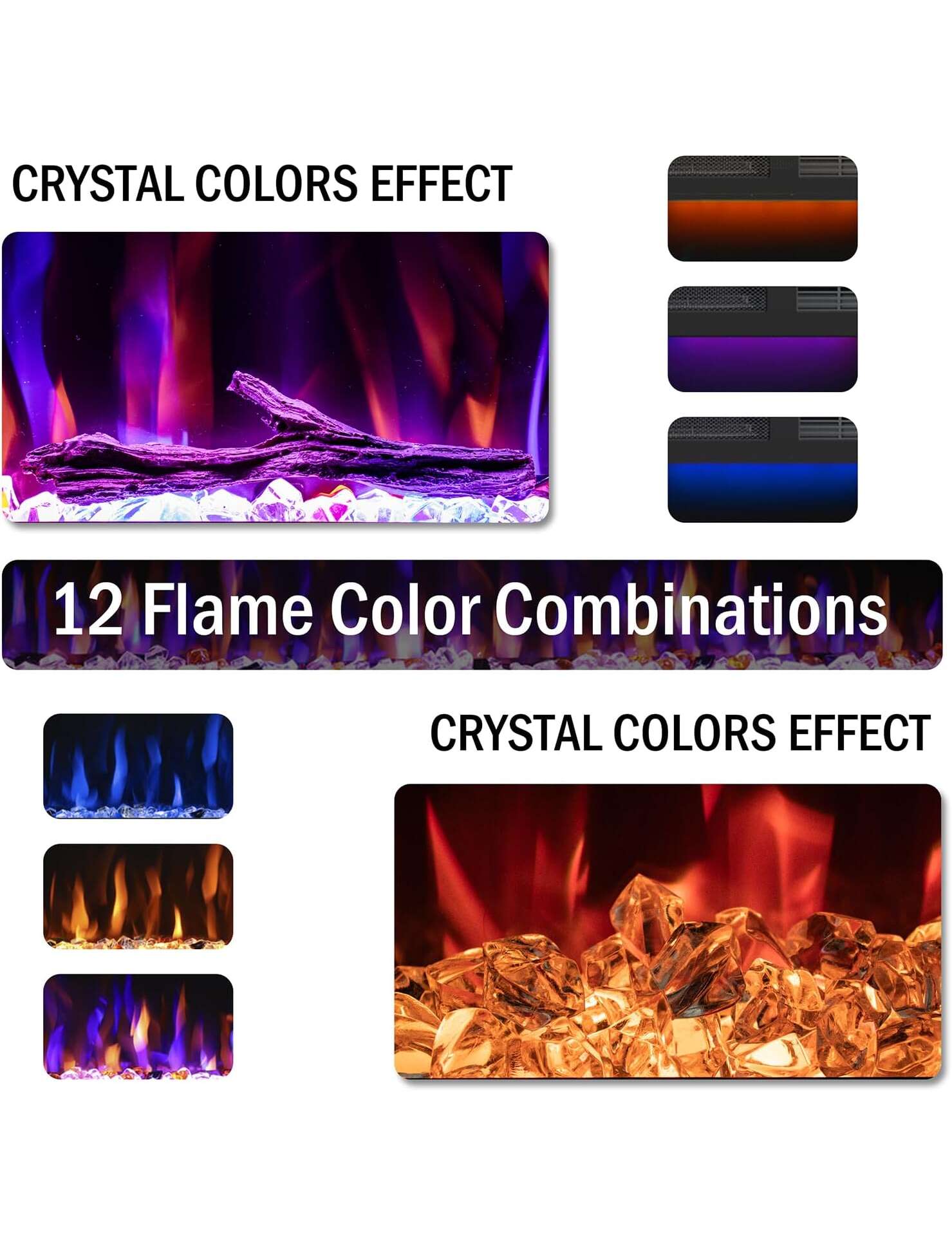 Elektriskajam kamīnam ir funkcija, kas ļauj izvēlēties liesmas krāsu - dzeltenu, zilu, violetu. Kamīnam ir arī augšējā apgaismojuma funkcija, kas skaita trīs krāsas.