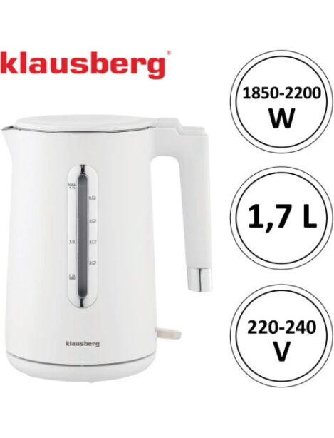 | Elektriskā tējkanna Klausberg KB 7890 no nerūsējošā tērauda ar grozāmu pamatni, baltā krāsā, tilpums 1,7 l un jauda 1850–2200 W. 1,7 litru ietilpība ir ideāli piemērota visai ģimenei, ļaujot ātri pagatavot vairākas tasītes tējas, kafijas vai verdošu ūdeni ēdiena gatavošanai, savukārt jaudīgais 1850–2200 W sildelements nodrošina ātru uzvārīšanu pat pilnai tējkannai. Korpuss ir izgatavots no augstas kvalitātes 304 nerūsējošā tērauda un PP plastmasas, nodrošinot izturību un aizsardzību pret koroziju, bet stilīgais matēti baltais dizains ar hroma akcentiem piešķir universālu un elegantu izskatu jebkurai virtuvei. Slēptais plakanais sildelements atvieglo tīrīšanu, uzlabo higiēnu un samazina kaļķakmens veidošanos, bet 360° grozāmā pamatne nodrošina ērtu lietošanu gan labročiem, gan kreiļiem. Snīpis ar filtra sietu efektīvi aiztur nosēdumus un kaļķakmens daļiņas, garantējot tīru ūdeni katrā tasītē, savukārt viegli nolasāmais ūdens līmeņa indikators ļauj ātri pārbaudīt ūdens daudzumu neatverot tējkannu. Ergonomisks rokturis nodrošina drošu un ērtu satvērienu pat pilnai tējkannai, bet klusā darbība padara to par ideālu izvēli mierīgai mājas vai biroja videi. Papildu funkcijas ietver zemu enerģijas patēriņu, automātisku izslēgšanos pēc uzvārīšanas, aizsardzību pret pārkaršanu, termiski izolētu konstrukciju, kas samazina korpusa uzkaršanu un apdegumu risku, kā arī stabilu pamatni drošai novietošanai uz darba virsmas. |