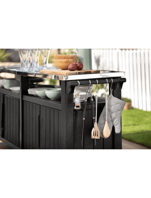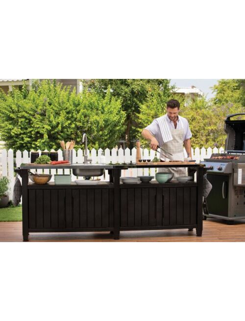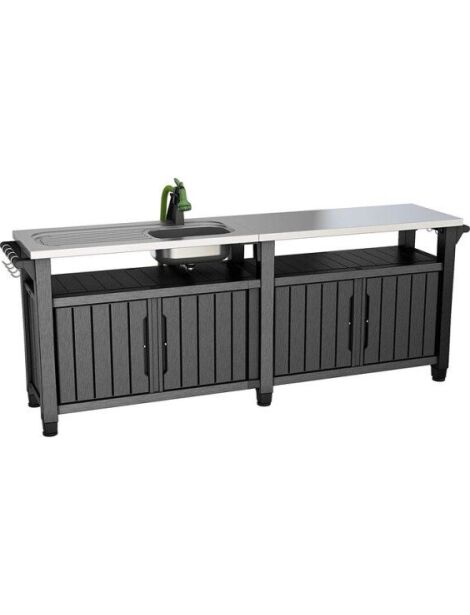Āra virtuves mantu glabātuve ar galda virsmu un izlietni jebkurai izklaidējošai vai BBQ videi. Pastiprināta nerūsējošā tērauda galda virsma un iebūvēta izlietne. Ūdens ieplūdes un izplūdes sastāvdaļas: dārza šļūtenes adapteris caurduris un 90 cm/3 šļūtene. Slēdzami glabāšanas skapji un īpaši liels saimniecības plaukts. Regulējamas kājas. Nerūsējošā tērauda rokturis papīra dvieļu turētājs 4 āķi un pudeļu attaisāmais. Izturīga bez apkopes sveķu konstrukcija. Viegli montējams viegli lietojams viegli tīrāms.
