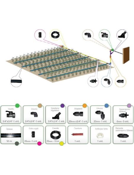 Laistīšanas sistēma ir paredzēta lai apūdeņotu līdz 70m2. Piemērots lielākām siltumnīcām vai dārzu apūdeņošanai. Tas ir ideāls risinājums laistīšanai: salātiem burkāniem garšaugiem zemenēm tomātiem gurķiem paprikai un citiem līdzīga veida augiem. |