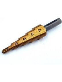 Pakāpju urbis 4 6 8 10 12 mm kokam metālam plastmasai. Pakāpju urbji tiek izmantoti plastmasas skārda un plānu metāla lokšņu urbšanai. Šo urbjmašīnu griešanas malas dizains nodrošina vienmērīgu urbšanu urbis neiesprūst apstrādājamā detaļā un tiek iegūts tīrs caurums. Urbjot plastmasu lokšņu metālu vai plānu metālu ar parasto metāla urbi jūs nekad nesaņemsit šādu rezultātu jo tā griezējmala pastāvīgi iestrēgs izurbtais caurums būs neregulārs tā malas būs nelīdzenas un deformētas. Pakāpju urbju konusam ir noteikta diametra pakāpieni pakāpieni tāpēc ar šiem urbjiem var urbt precīza diametra urbumus. |