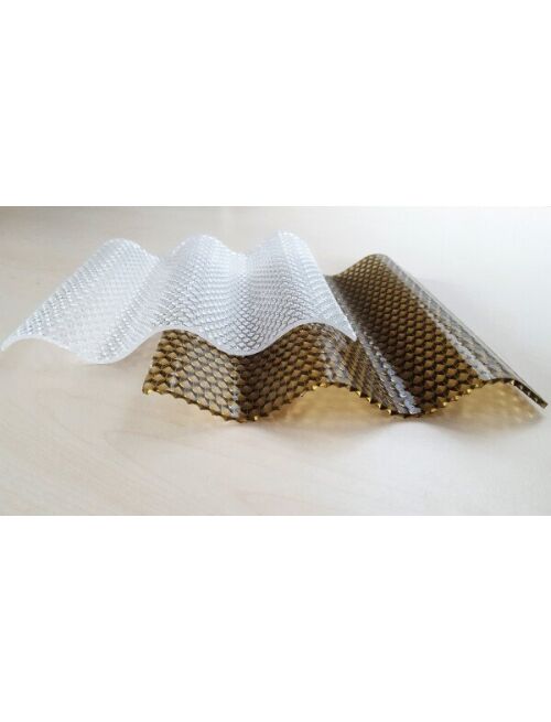 Profilētās polikarbonāta loksnes MC PC DIAMONDS DIMANTA POLIKARBONĀTA SEGUMS MC PC DIAMONDS ir ārkārtīgi stingras izturīgas viļņotas polikarbonāta loksnes . 28mm biezās loksnes ir stingrākas un cietākas nekā cita veida plastmasa un tām ir izcilas nestspējas īpašības. Dabiski caurspīdīgas loksnes nodrošina izcilu gaismas caurlaidību. Loksnes kas ir pārklātas ar pret UV stariem izturīgu slāni ir izturīgas pret temperatūras svārstībām kā arī ilgstošu atmosfēras iedarbību.