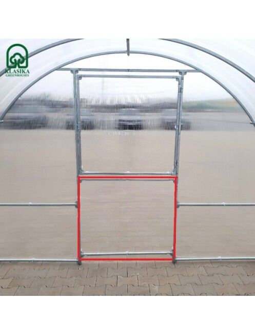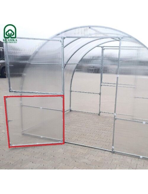 Papildu durvis siltumnīcas aizmugurēParedzēts siltumnīcas papildus ventilācijaiIzgatavots no cinkotas kvadrātveida profila 20x20mmNepieciešamais papildus polikarbonāta pārklājums 105 2 mPārklājums tiek pasūtīts atsevišķi