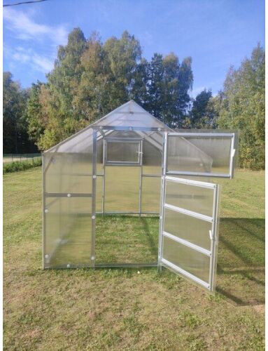 Īpašības: Platums 235 m Garums 5 m Augstums 235 m Karkass Cinkots metāls 1mm biezumā Profils Omega 56 mm plats Pamati Nav Attālums starp arkām 099m Skrūves M5 Pastiprinājuma profili arkām Ir Sniega slodze 220 kg/m2 Stiprināšana Katra arka rokās zemā 35cm dziļumā Polikarbonāta biezums 4mm 10 gadu garantija Polikarbonāta stiprināšana Skrūve plastmasas paplāksne D40mm Gumijas blīvējums Nav Montāžas instrukcija Ir Durvis 1 gab Divviru Logs 2 gab Lūka ar automātisko atvērēju Atsevišķi pasūtot