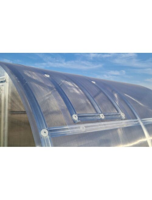 Īpašības: Platums 2 m Garums 2 m Augstums 21 m Karkass Cinkots metāls 1mm biezumā Profils Omega 56 mm plats Attālums starp arkām 1m Skrūves M5 Pastiprinājuma profili arkām Jā Sniega slodze 240 kg/m2 Stiprināšana Katra arka rokās zemā 35cm dziļumā Polikarbonāta biezums 6mm 10 gadu garantija Polikarbonāta stiprināšana Skrūve plastmasas paplāksne D40mm Montāžas instrukcija Ir Durvis 1 gab Divviru Logs 2 gab Lūka ar automātisko atvērēju Atsevišķi pasūtot