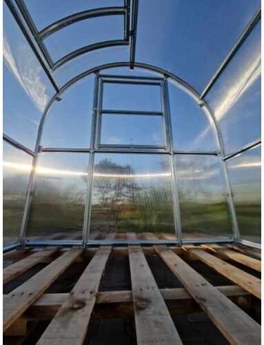 Īpašības: Platums 2 m Garums 4 m Augstums 21 m Karkass Cinkots metāls 1mm biezumā Profils Omega 56 mm plats Attālums starp arkām 1m Skrūves M5 Pastiprinājuma profili arkām Jā Sniega slodze 240 kg/m2 Stiprināšana Katra arka rokās zemā 35cm dziļumā Polikarbonāta biezums 4mm 10 gadu garantija Polikarbonāta stiprināšana Skrūve plastmasas paplāksne D40mm Montāžas instrukcija Ir Durvis 1 gab Divviru Logs 2 gab Lūka ar automātisko atvērēju Atsevišķi pasūtot