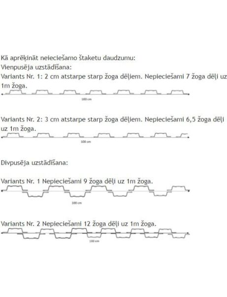 Kā aprēķināt neieciešamo štaketu daudzumu: Vienpusēja uzstādīšana: Variants Nr. 1:2 cm atstarpe starp žoga dēļiem. Nepieciešami 7 žoga dēļi uz 1m žoga.