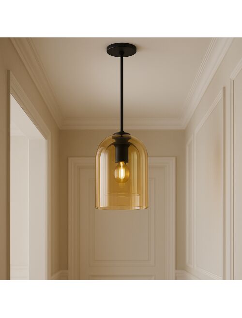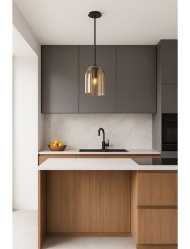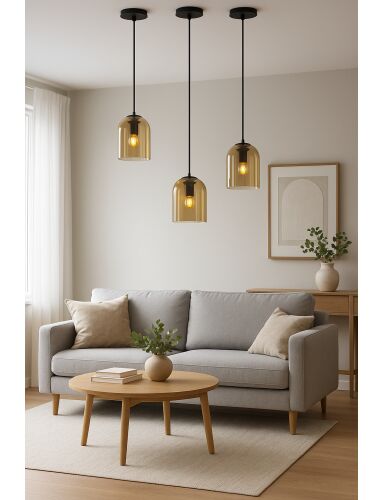 Bursztynowa, szklana lampa wisząca wprowadza do wnętrza miękkie, ciepłe światło i subtelny połysk. Transparentny klosz z bursztynowego szkła eksponuje dekoracyjną żarówkę, a czarne detale dodają nowoczesnego charakteru.