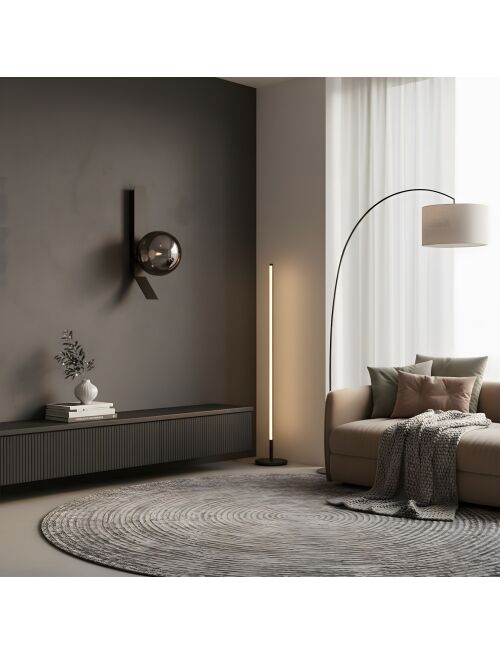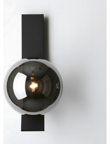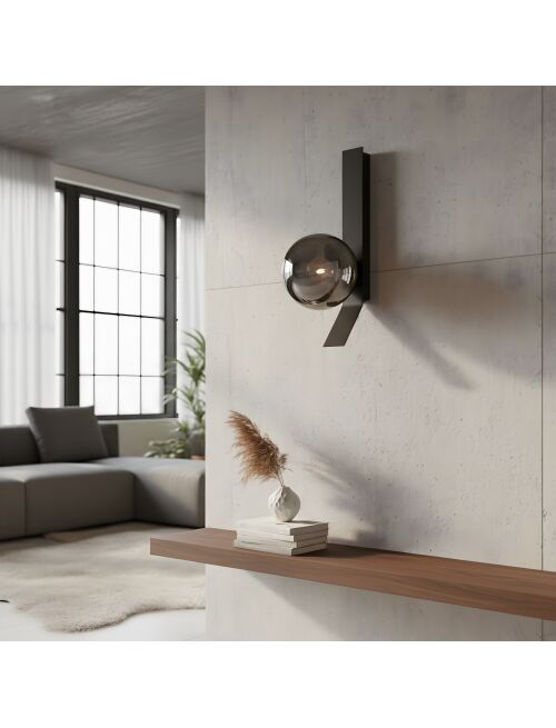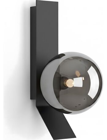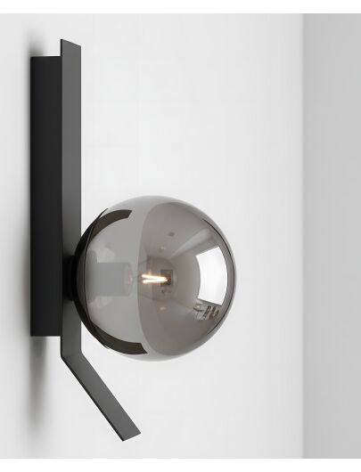 Kinkiet APP1757-1W łączy minimalistyczną, czarną linię z lśniącą kulą w odcieniu dymionego chromu. Geometryczna forma porządkuje ścianę, a półtransparentny klosz buduje nastrojowy blask, który dodaje wnętrzu elegancji i głębi.