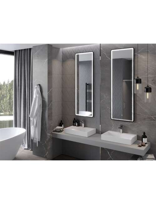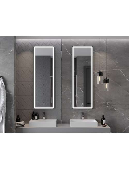 Dane techniczne: Rozmiar: 50 x 150 cm Głębokość: 26 mm Grubość szkła: 4 mm Włącznik podświetlania: Dotykowy Barwa LED: Zimna - 6000K Liczba diod LED: 60/mb Zużycie energii: 4,8 W/mb Napięcie wejściowe: 230 V Klasa energetyczna: F (dawniej A+) Stopień ochrony: IP44 & certyfikat CE Lustro posiada mate grzewczą, która po włączeniu zapobiega powstawaniu pary Zasilanie przygotowane do podłączania pod instalację elektryczną w ścianie |