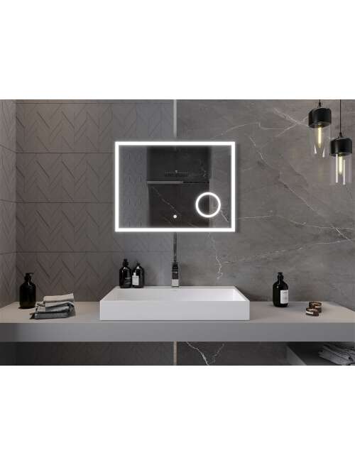 Dane techniczne: Rozmiar: 80 x 60 cm Głębokość: 25 mm Grubość szkła: 4 mm Włącznik podświetlania: Dotykowy Barwa LED: Zimna - 6000K Liczba diod LED: 60/mb Zużycie energii: 4,8 W/mb Napięcie wejściowe: 230 V Klasa energetyczna: F (dawniej A+) Stopień ochrony: IP44 & certyfikat CE Lustro posiada mate grzewczą, która po włączeniu zapobiega powstawaniu pary Dodatkowe lusterko kosmetyczne LED z 3-krotnym powiększeniem Zasilanie przygotowane do podłączania pod instalację elektryczną w ścianie |