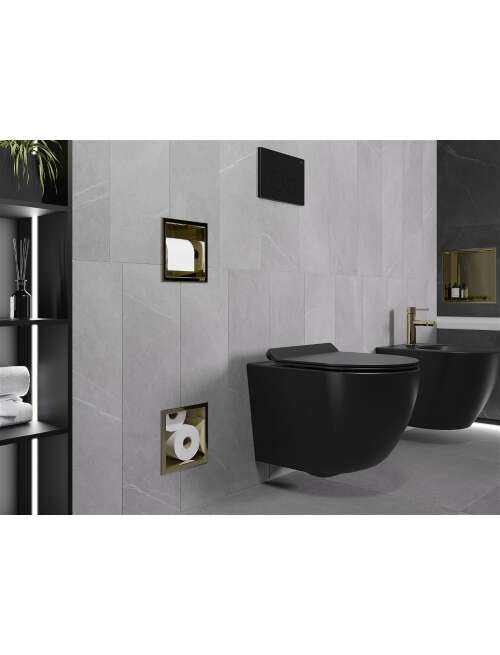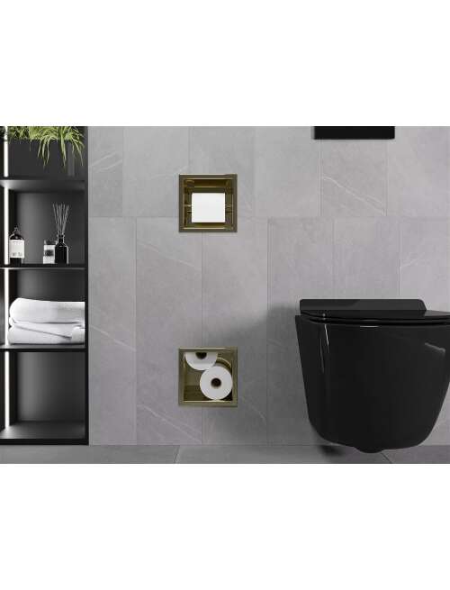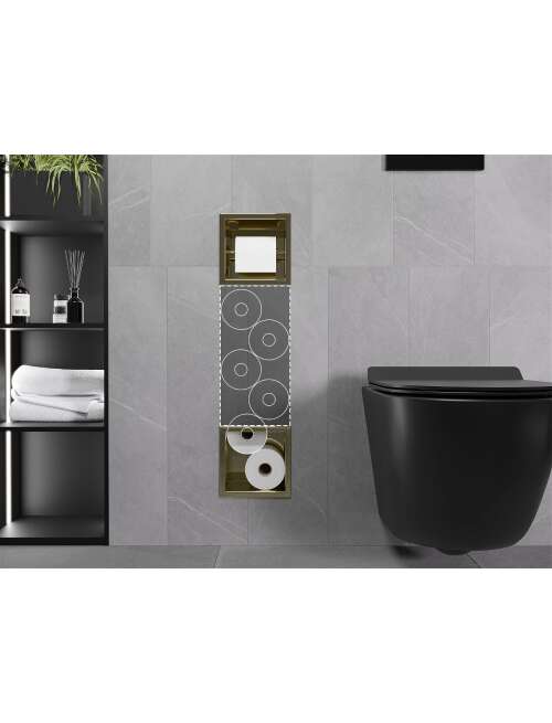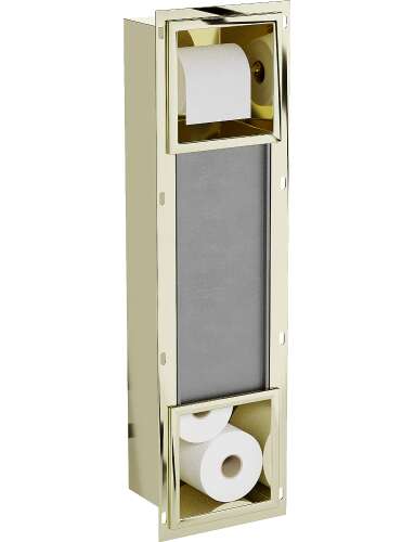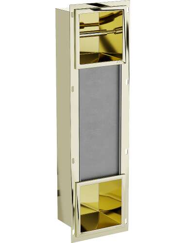 Dane techniczne: Materiał: Stal nierdzewna Wykończenie: Złoty Szerokość: 19,5 cm Wysokość: 74 cm Odległość od ściany: 12,1 cm Do zabudowy w ścianie - nie zabiera miejsca |