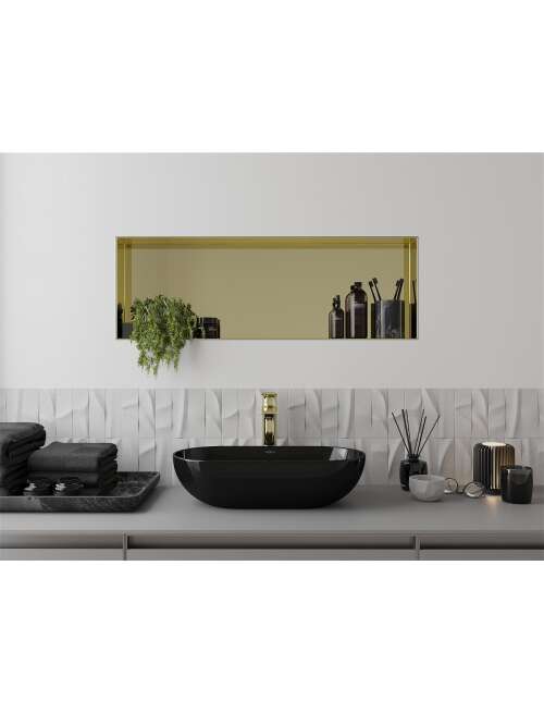 Dane techniczne: Materiał: Stal nierdzewna AISI 304 Szerokość: 90 x 30 cm Głębokość montażu: 10 cm Wykończenie: Złoty Kołnierz maskujący: Nie Do zabudowy w ścianie Uniwersalne zastosowanie Odporność na matowienie i korozję |
