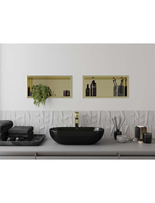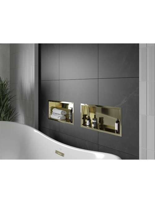 Specyfikacja produktu:Materiał: Stal nierdzewna AISI 304 Szerokość: 45 x 20 cm Głębokość montażu: 10 cm Wykończenie: Złoty Kołnierz maskujący: Tak Do zabudowy w ścianie Uniwersalne zastosowanie Odporność na matowienie i korozję |
