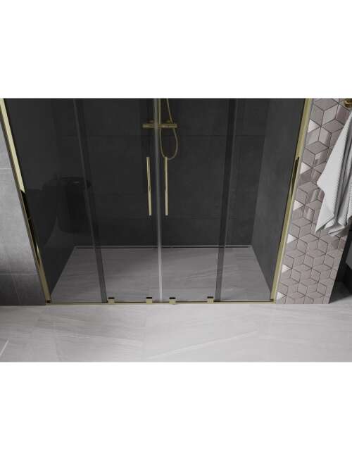 Specyfikacja produktu:Rozmiar: 170x200 cm Montaż: Uniwersalny Wejście: Rozsuwane Kolor szkła: Grafit Rodzaj szkła: Hartowane Grubość szkła: 8 mm Profil: Aluminiowy Wykończenie: Złoty Powłoka ułatwiająca czyszczenie Niwelacja nierówności ściany Regulacja szerokości Możliwość montażu na brodziku lub płytkach Uchwyt ze stali nierdzewnej Komplet uszczelek odprowadzających wodę Aluminiowy próg uszczelniający drzwi |