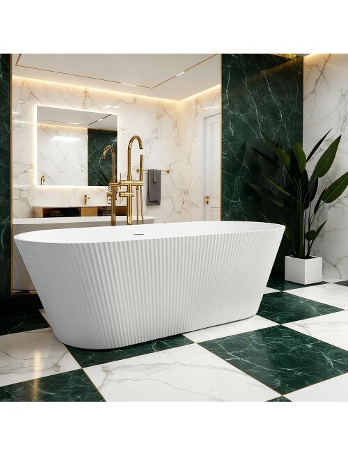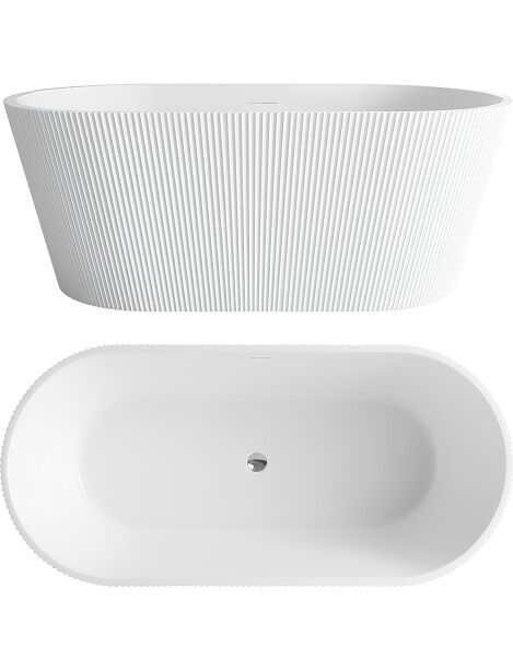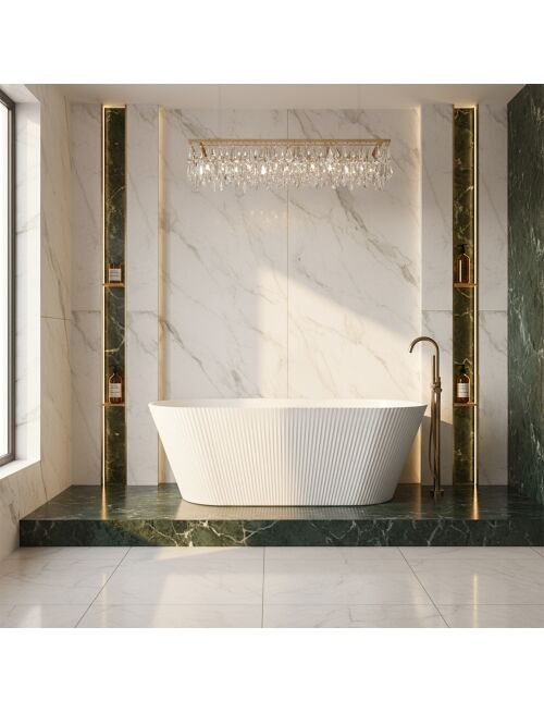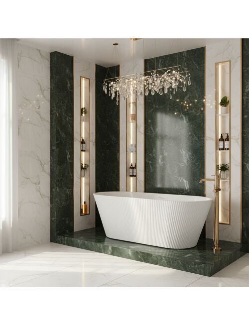 Dzięki swojej wolnostojącej konstrukcji, wanna Ofelia może być ustawiona w dowolnym miejscu łazienki — przy ścianie, w rogu lub na środku pomieszczenia, tworząc elegancką i harmonijną przestrzeń kąpielową. Ryflowana struktura boczna pięknie odbija światło, dodając wnętrzu głębi i wyjątkowego uroku. |