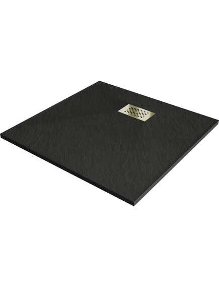 Dane techniczne: Rozmiar: 70x70x2,6 cm Kolor: Czarny Typ: Kwadratowy, Ultrapłaski Montaż: W posadzce lub na posadzce Materiał: SMC - tworzywo sztuczne Struktura kamienia Możliwość przycięcia brodzika Trwały produkt, który nie ulegnie deformacji Maksymalna stabilność dzięki dobrej odporności na uderzenia W komplecie syfon czyszczony od góry Średnica odpływu: 90 mm Wykończenie maskownicy: Złote |