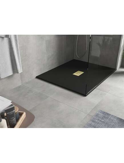 Dane techniczne: Rozmiar: 120x100x2,6 cm Kolor: Czarny Typ: Prostokątny, Ultrapłaski Montaż: W posadzce lub na posadzce Materiał: SMC - tworzywo sztuczne Struktura kamienia Możliwość przycięcia brodzika Trwały produkt, który nie ulegnie deformacji Maksymalna stabilność dzięki dobrej odporności na uderzenia W komplecie syfon czyszczony od góry Średnica odpływu: 90 mm Wykończenie maskownicy: Złote |