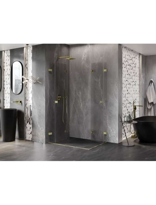 Specyfikacja produktu:Rozmiar: 80x75 cm Wysokość: 200 cm Strona montażu: Uniwersalna Wejście: Drzwi składane Kolor szkła: Transparentne Wykończenie: Złoty szczotkowany Profil: Aluminiowy Rodzaj szkła: Hartowane Grubość szkła: 6 mm Powłoka ułatwiająca czyszczenie Możliwa regulacja szerokości Dwa systemy mocowania: - Z profilem, który umożliwia niwelacje nierówności ściany - Bez profilu w przypadku idealnie prostych ścian Możliwość montażu na brodziku lub płytkach Mosiężne klamry i zawiasy zlicowane z taflą szkła Listwa magnetyczna oraz uszczelki elastomerowe odprowadzające wodę Aluminiowy próg uszczelniający drzwi |