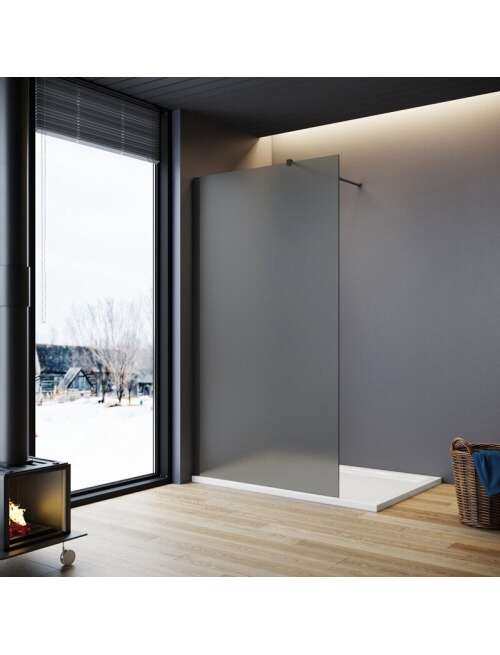 Stacionari dušo sienelė be padėklo Matmenys: 130 x 200 cm Atraminio sieninio stabilizavimo laikiklio ilgis: 70-120 cm Juodos spalvos aliuminio profilis. Sienelės pločio reguliavimo diapazonas: 130-131,5 cm Matinis, pilkai tonuotas grūdintas, 8 mm stiklas. Vidinės stiklo pusės paviršius - nematintas, padengtas NANO danga, kuri apsaugo nuo kalkių nuosėdų ir užtikrina ilgalaikį skaidrumą. NANO danga apdorotą stiklą lengviau nuvalyti, jis ilgiau išlaiko patrauklią išvaizdą. Sienelė montuojama tiesiog ant grindų, kuriose įrengtas nutekamasis latakas arba statoma ant dušo padėklo. Montavimo būdas - universalus (kairinis/dešininis). |