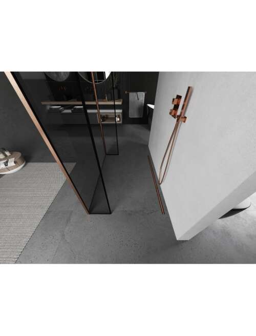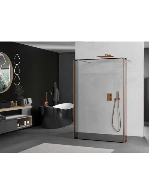 Specyfikacja produktu:Szerokość: 140x30x30 cm (ścianka X - 140 cm, ścianka Y - 30 cm) Wysokość: 200 cm Montaż: Uniwersalny Kolor szkła: Czarny wzór Wykończenie: Miedź szczotkowana Rodzaj szkła: Hartowane Grubość szkła: 8 mm Profil: Aluminiowy Wspornik: Stal nierdzewna Długość max. wspornika: 150 cm Możliwość przycięcia wspornika Powłoka ułatwiająca czyszczenie Niwelacja nierówności ściany Możliwość montażu na brodziku lub płytkach |