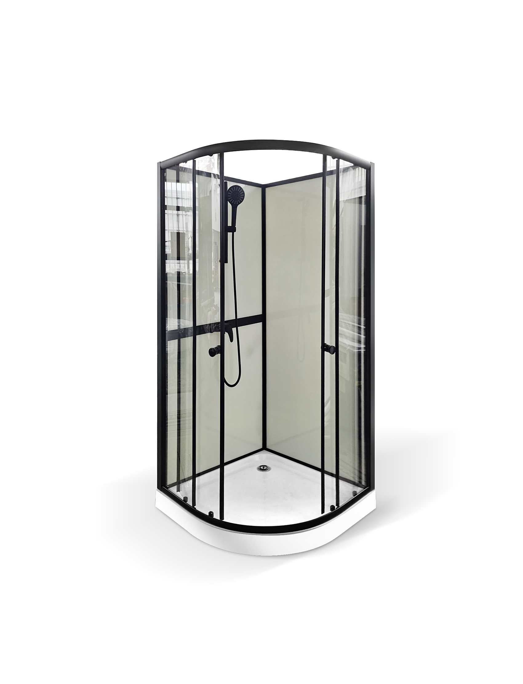 Характеристики: 1. Толщина стекла: 4 мм 2. Цвет стекла: передние стекла прозрачные, задняя стенка белая 3. Цвет профилей: черный 4.Tип колесиков: черные верх: двойные низ: одинарные 5. Tип поддона: низкий (12 см), душевой поддон 6. Упаковка: 3 коробки 7. Сифон входит в комплектацию 8. Черный смеситель и ручной душ 9. Без крыши | ||||||||||