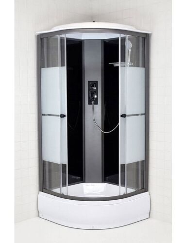 Pusapvalė ketursienė dušo kabina su aukštu akrilo padėklu Matmenys: 80 x 80 x 215 cm Padėklo aukštis: 30 cm Antracito spalvos aliuminio rėmas. Priekinė sienelė - 5 mm grūdinto stiklo, dekoruoto matinėmis juostomis. Galinė sienelė - 4 mm grūdinto, juodos spalvos stiklo. Komplekte: lietaus efekto dušas, rankinis dušas, maišytuvas, metalinė lentynėlė, sifonas. |