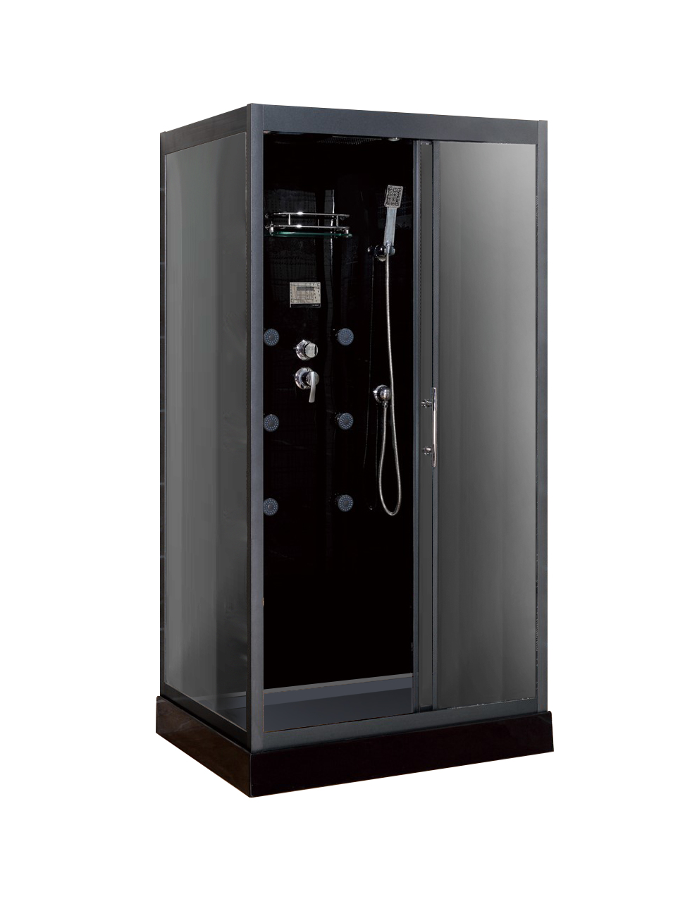 Характеристики: 1. Толщина стекла: 5 мм 2. Цвет стекла: передние стекла прозрачные, задняя стенка - черное стекло 3. Цвет профилей: серые 4. Крыша с интегрированным душем 5. Стеклянная полочка 6. Массажная панель 7.Верхнее освещение 7.Tип колесиков: верх: двойные, низ: одинарные 8. Tип поддона: 30 см, душевой поддон 9. Упаковка: 4 коробки 10. Сифон входит в комплектацию | ||||||||||