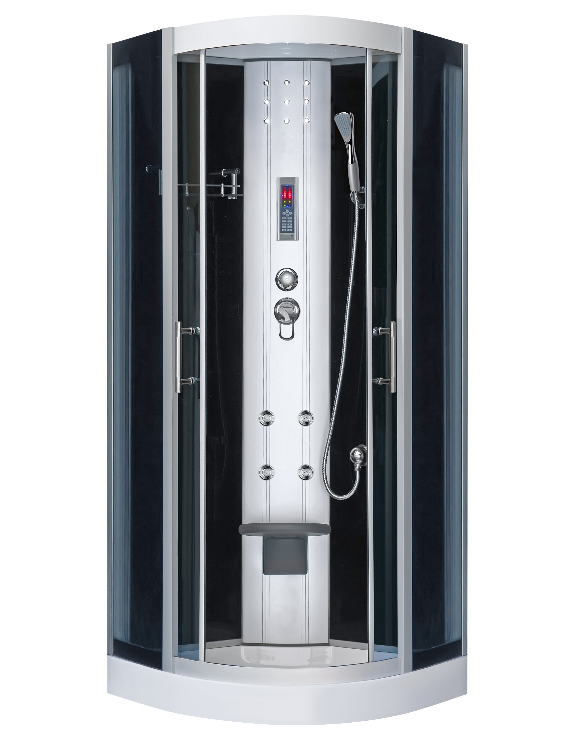 Характеристики: 1. Толщина стекла: 4 мм 2. Цвет стекла: передние стекла серые, задняя стенка - черное стекло 3. Цвет профилей: матовое серебро 4. Крыша с интегрированным душем 5. Стеклянная полочка 6. Массажная панель с электричнским управлением 7. Верхнее и боковое LED освещение 8. Вентиляция 9.Tип колесиков: серые верх: двойные низ: одинарные 10. Tип поддона: низкий (15 см), душевой поддон 11. Упаковка: 4 коробки 12. Сифон входит в комплектацию | ||||||||||