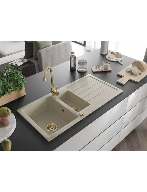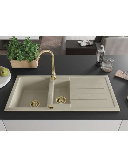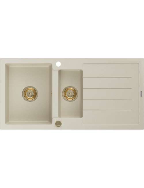 Dane techniczne: Rozmiar: 1000x500x200 mm Głębokość komory: 190 mm (większa), 115 mm (mniejsza) Wymiary komory: 430x330 mm (większa), 340x170 mm (mniejsza) Średnica odpływu: ø90 mm Rodzaj: 1,5-komorowy z ociekaczem Typ: Wpuszczany w blat Materiał: Granit Kolor: Beżowy Wykończenie syfonu: Złoty Otwór przelewowy: Tak Otwór na baterie: Tak Syfon automatyczny w komplecie Wysoka odporność na zarysowania i przebarwienia Odporność na szok termiczny Powierzchnia ułatwiająca czyszczenie |
