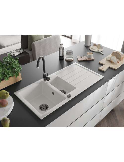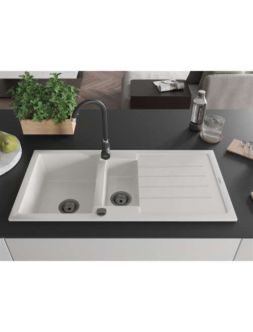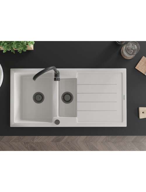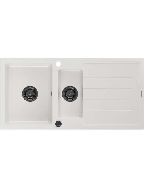 Dane techniczne: Rozmiar: 1000x500x200 mm Głębokość komory: 190 mm (większa), 115 mm (mniejsza) Wymiary komory: 430x330 mm (większa), 340x170 mm (mniejsza) Średnica odpływu: ø90 mm Rodzaj: 1,5-komorowy z ociekaczem Typ: Wpuszczany w blat Materiał: Granit Kolor: Biały Wykończenie syfonu: Czarny Otwór przelewowy: Tak Otwór na baterie: Tak Syfon automatyczny w komplecie Wysoka odporność na zarysowania i przebarwienia Odporność na szok termiczny Powierzchnia ułatwiająca czyszczenie |