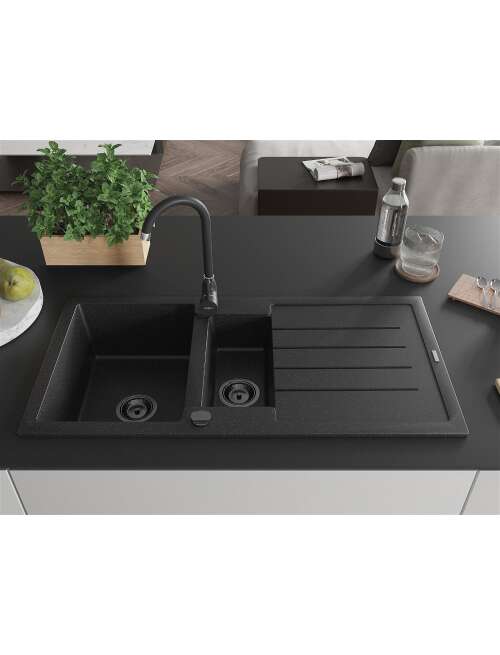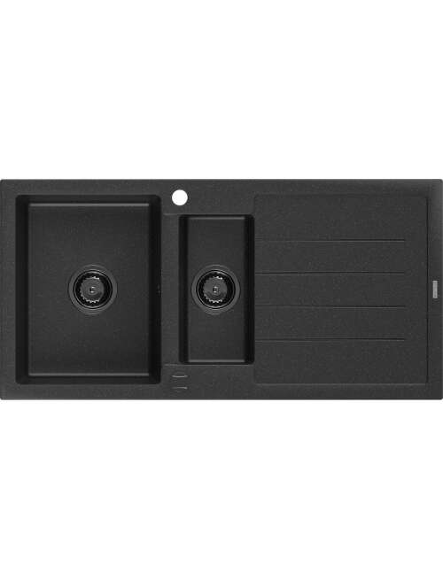 Dane techniczne: Rozmiar: 1000x500x200 mm Głębokość komory: 190 mm (większa), 115 mm (mniejsza) Wymiary komory: 430x330 mm (większa), 340x170 mm (mniejsza) Średnica odpływu: ø90 mm Rodzaj: 1,5-komorowy z ociekaczem Typ: Wpuszczany w blat Materiał: Granit Kolor: Czarny/Srebrny metalik Wykończenie syfonu: Czarny Otwór przelewowy: Tak Otwór na baterie: Tak Syfon automatyczny w komplecie Wysoka odporność na zarysowania i przebarwienia Odporność na szok termiczny Powierzchnia ułatwiająca czyszczenie |