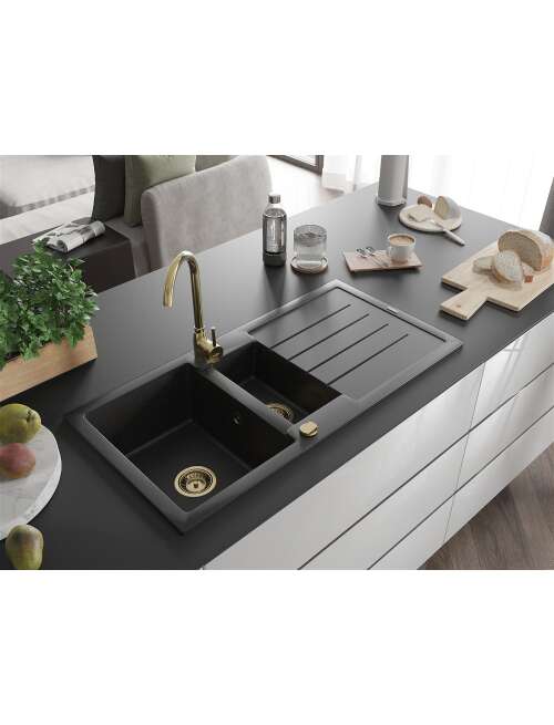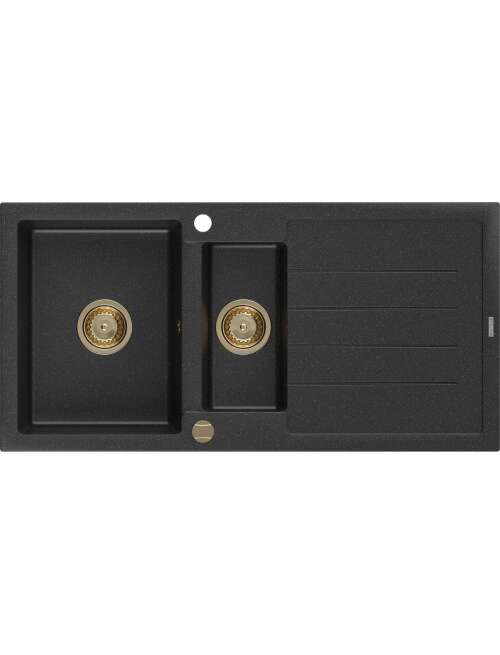 Dane techniczne: Rozmiar: 1000x500x200 mm Głębokość komory: 190 mm (większa), 115 mm (mniejsza) Wymiary komory: 430x330 mm (większa), 340x170 mm (mniejsza) Średnica odpływu: ø90 mm Rodzaj: 1,5-komorowy z ociekaczem Typ: Wpuszczany w blat Materiał: Granit Kolor: Czarny/Srebrny metalik Wykończenie syfonu: Złoty Otwór przelewowy: Tak Otwór na baterie: Tak Syfon automatyczny w komplecie Wysoka odporność na zarysowania i przebarwienia Odporność na szok termiczny Powierzchnia ułatwiająca czyszczenie |