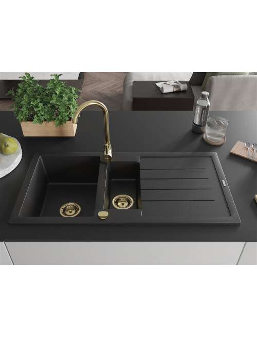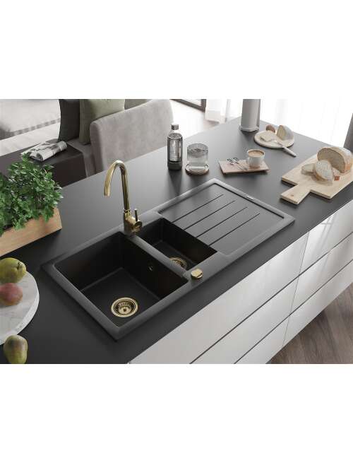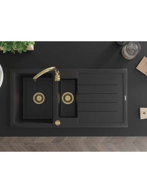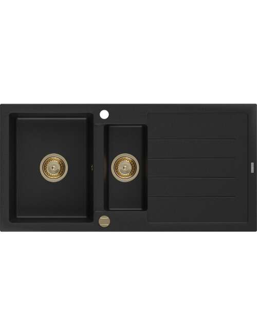 Dane techniczne: Rozmiar: 1000x500x200 mm Głębokość komory: 190 mm (większa), 115 mm (mniejsza) Wymiary komory: 430x330 mm (większa), 340x170 mm (mniejsza) Średnica odpływu: ø90 mm Rodzaj: 1,5-komorowy z ociekaczem Typ: Wpuszczany w blat Materiał: Granit Kolor: Czarny Wykończenie syfonu: Złoty Otwór przelewowy: Tak Otwór na baterie: Tak Syfon automatyczny w komplecie Wysoka odporność na zarysowania i przebarwienia Odporność na szok termiczny Powierzchnia ułatwiająca czyszczenie |