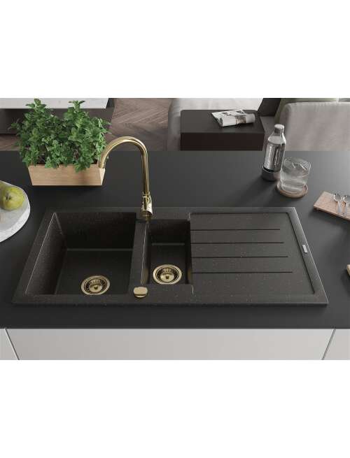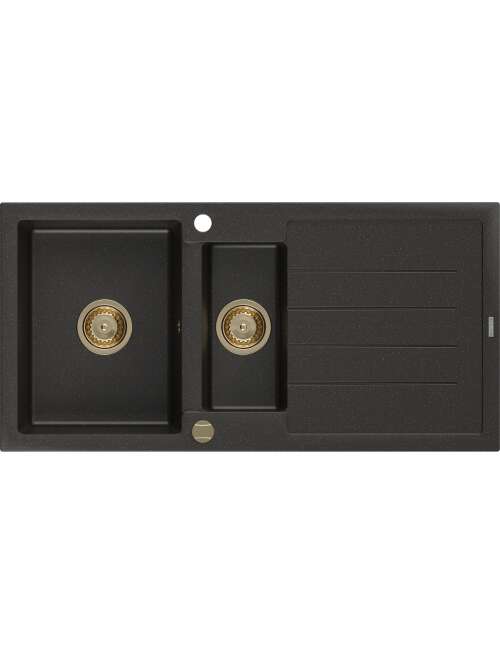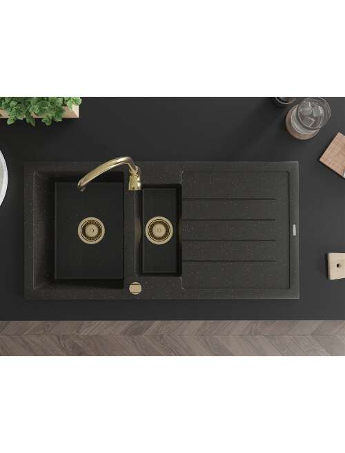 Mexen Andres zlewozmywak granitowy 1,5-komorowy z ociekaczem 1000 x 500 mm czarny/złoty metalik, syfon złoty - 6515101510-75-G