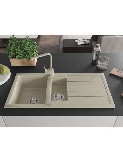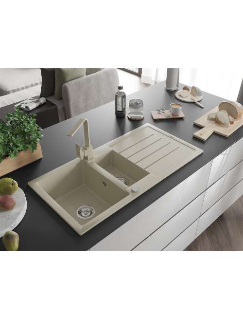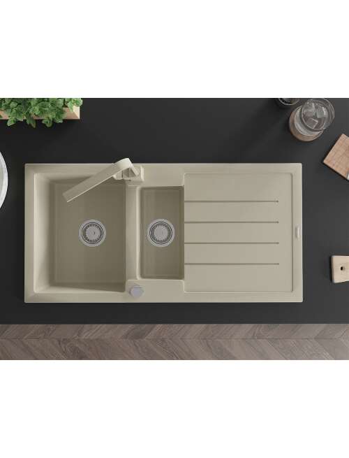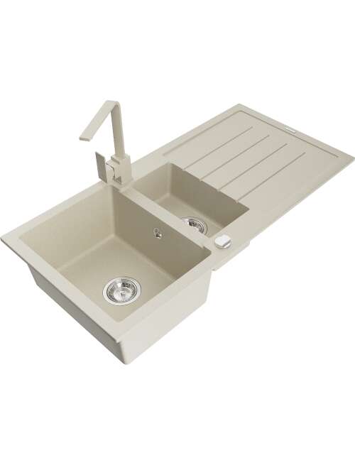 Dane techniczne: Zlewozmywak: Rozmiar: 1000x500x200 mm Głębokość komory: 190 mm (większa), 115 mm (mniejsza) Wymiary komory: 430x330 mm (większa), 340x170 mm (mniejsza) Średnica odpływu: ø90 mm Typ: 1,5-komorowy z ociekaczem Rodzaj: Wpuszczany w blat Kolor: Beżowy Wykończenie syfonu: Chrom Materiał: Granit (80% kruszywo granitowe 20% żywice) Otwór przelewowy: Tak Otwory: ( bateria, automat ) 2 Montaż: Uniwersalny, możliwość montażu z ociekaczem po lewej lub prawej stronie Wysoka odporność na zarysowania i przebarwienia Odporność na szok termiczny Powierzchnia ułatwiająca czyszczenie Dwa dodatkowe podfrezowane otwory do samodzielnego wybicia ø35 Bateria kuchenna: Materiał: Mosiądz Kolor: Beżowy Głowica: Ceramiczna Perlator: Tak Typ: Jednouchwytowa Wysokość baterii: 290 mm Zasięg wylewki: 220 mm |