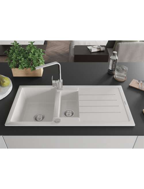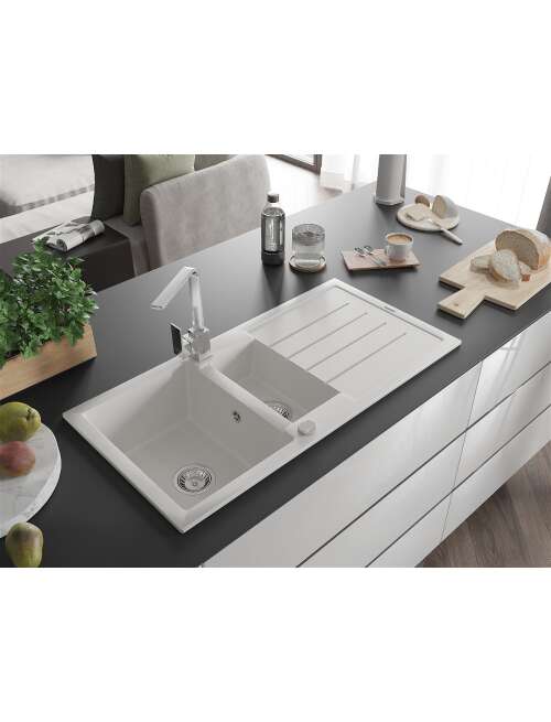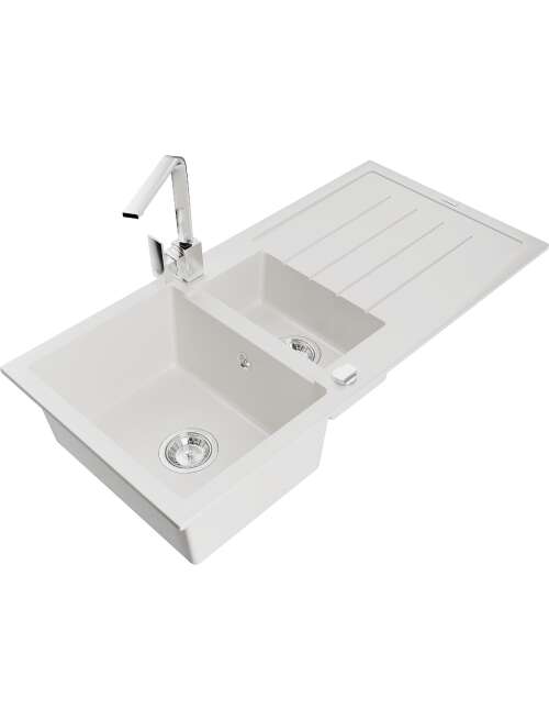 Mexen Andres zlewozmywak granitowy 1,5-komorowy z ociekaczem i baterią kuchenną Rita, biały - 6515-20-670300-00