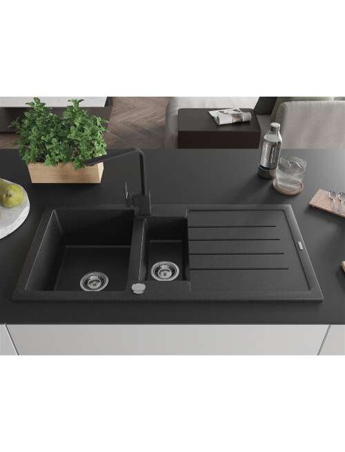 Mexen Andres zlewozmywak granitowy 1,5-komorowy z ociekaczem i baterią kuchenną Rita, czarny/srebrny metalik - 6515-73-670300-70