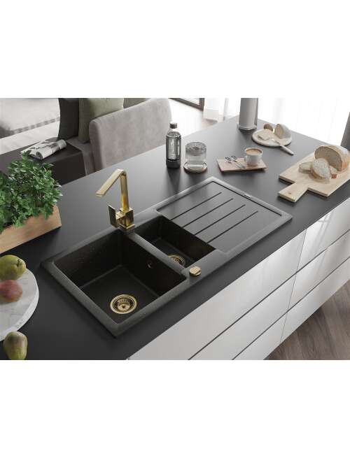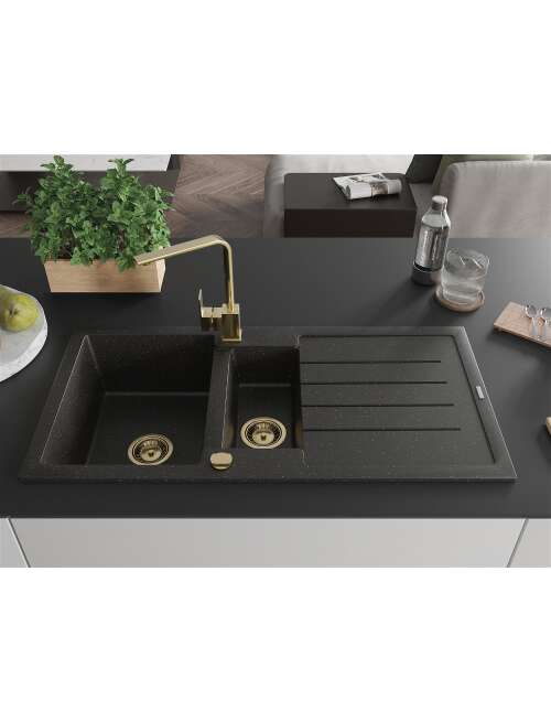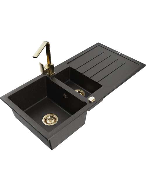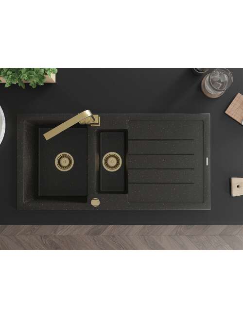 Mexen Andres zlewozmywak granitowy 1,5-komorowy z ociekaczem i baterią kuchenną Rita, czarny/złoty metalik- 6515-75-670300-50