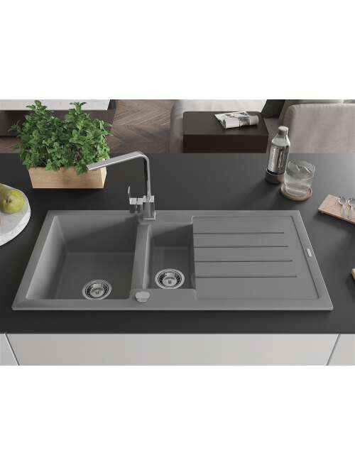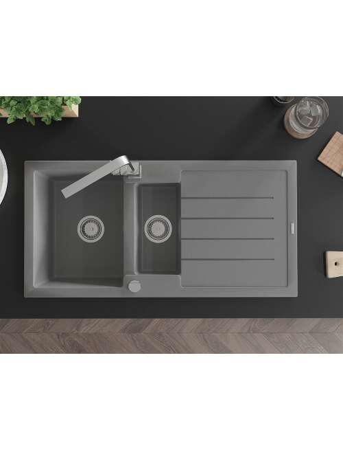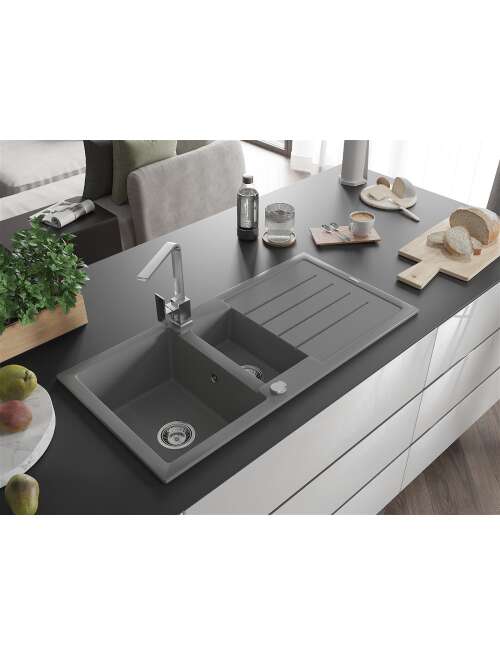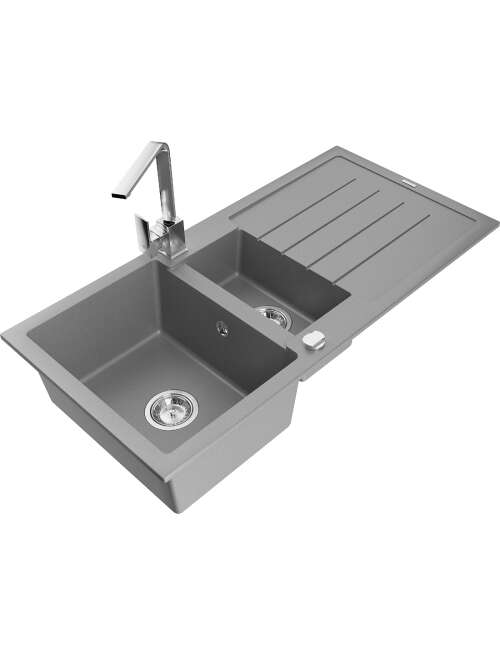 Dane techniczne: Zlewozmywak: Rozmiar: 1000x500x200 mm Głębokość komory: 190 mm (większa), 115 mm (mniejsza) Wymiary komory: 430x330 mm (większa), 340x170 mm (mniejsza) Średnica odpływu: ø90 mm Typ: 1,5-komorowy z ociekaczem Rodzaj: Wpuszczany w blat Kolor: Szary Wykończenie syfonu: Chrom Materiał: Granit (80% kruszywo granitowe 20% żywice) Otwór przelewowy: Tak Otwory: ( bateria, automat ) 2 Montaż: Uniwersalny, możliwość montażu z ociekaczem po lewej lub prawej stronie Wysoka odporność na zarysowania i przebarwienia Odporność na szok termiczny Powierzchnia ułatwiająca czyszczenie Dwa dodatkowe podfrezowane otwory do samodzielnego wybicia ø35 Bateria kuchenna: Materiał: Mosiądz Kolor: Chrom Głowica: Ceramiczna Perlator: Tak Typ: Jednouchwytowa Wysokość baterii: 290 mm Zasięg wylewki: 220 mm |